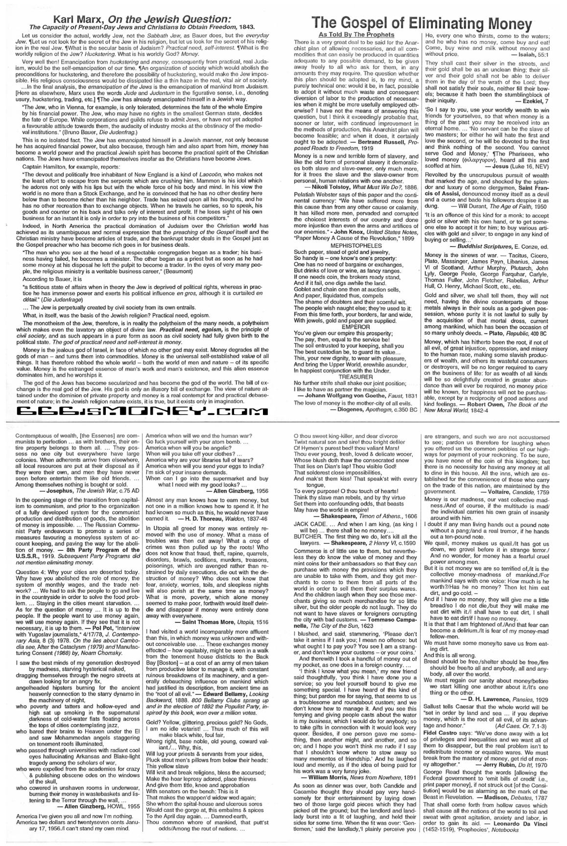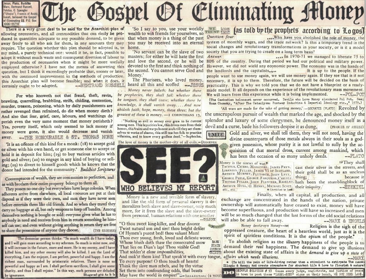 There is a very great deal to be said for the Anarchist plan of allowing necessaries, and all commodities that can easily be produced in quantities adequate to any possible demand, to be given away freely to all who ask for them, in any amounts they may require. The question whether this plan should be adopted is, to my mind, a purely technical one: would it be, in fact, possible to adopt it without much waste and consequent diversion of labor to the production of necessaries when it might be more usefully employed otherwise? I have not the means of answering this question, but I think it exceedingly probable that, sooner or later, with continued improvement in the methods of production, this Anarchist plan will become feasible; and when it does, it certainly ought to be adopted. — Bertrand Russell, Proposed Roads to Freedom, 1919 Money is a new and terrible form of slavery, and like the old form of personal slavery it demoralizes both slave and slave-owner, only much more, for it frees the slave and the slave- owner from personal, human relations with one another. — Nikoli Tolstoy, What Must We Do?, 1886 Pelatiah Webster says of this paper and the continental currency: "We have suffered more from this cause than from any other cause or calamity. It has killed more men, pervaded and corrupted the choicest interests of our country and done more injustice than even the arms and artifices of our enemies." — John Knox, United States Notes, "Paper Money A Cause of the Revolution," 1899 MEPHISTOPHELES: Such paper, stead of gold and jewelry, So handy is -- one knows one's property: One has no need of bargains or exchanges, But drinks of love or wine, as fancy ranges. If one needs coin, the brokers ready stand, And if it fail, one digs awhile the land. Goblet and chain one then at auction sells, And paper, liquidated thus, compels The shame of doubters and their scornful wit. The people wish naught else; they're used to it: From this time forth, your borders, far and wide, With jewels, gold and paper are supplied. EMPEROR: You've given our empire this prosperity; The pay, then, equal to the service be! The soil entrusted to your keeping, shall you The best custodian be, to guard its value. . . This, your new dignity, to wear with pleasure, And bring the Upper World, erewhile asunder, In happiest conjunction with the Under. TREASURER: No further strife shall shake our joint position; I like to have as partner the magician. — Johann Wolfgang von Goethe, Faust, 1831 The love of money is the mother-city of all evils. — Diogenes, Apothegm, c.350 BC Ho, every one ho thirsts, come to the waters; and he who has no money, come buy and eat! Come, buy wine and milk without money and without price. — Isaiah, 55:1 They shall cast their silver in the streets, and their gold shall be as an unclean thing; their silver and their gold shall not be able to deliver them in the day of the wrath of the Lord; they shall not satisfy their souls, neither fill their bowels; because it hath been the stumblingblock of their iniquity. — Ezekiel, 7 The orthodox Jews are right about not touching money (among many other things) on the sabbath – unless of course you are marking "666" (among other things) on the money. There is a saying (in the Talmud): "If everyone honored the sabbath, Messiahs would come." In Truth, which the Jews crucify, if no one touched money, there would be no need for a Messiah. — Raquel Baranow "So I say to you, use your worldly wealth to win friends for yourselves, so that when money is a thing of the past you may be received into an eternal home. . . "No servant can be the slave of two masters; for either he will hate the first and love the second, or he will be devoted to the first and think nothing of the second. You cannot serve God and Money." ¶The Pharisees, who loved money , heard all this and scoffed at him. — Jesus (Luke 16, NEV) Revolted by the unscrupulous pursuit of wealth that marked the age, and shocked by the splendor and luxury of some clergymen, Saint Francis of Assisi, denounced money itself as a devil and a curse and bade his followers despise it as dung. — Will Durant, The Age of Faith, 1950 It is an offence of this kind for a monk: to accept gold or silver with his own hand, or to get someone else to accept it for him; to buy various articles with gold and silver; to engage in any kind of buying or selling. — Buddhist Scriptures, E. Conze, ed. Let there be a small country with few people, Who, even having much machinery, don't use it. Who take death seriously and don't wander far away. Even though they have boats and carriages, they never ride in them. Having armor and weapons, they never go to war. Let them return to measurement by tying knots in rope. [Let them not need Money. — Raquel] Sweeten their food, give them nice clothes, a peaceful abode and a relaxed life. Even though the next country can be seen and its dogs and chickens can be heard, The people will grow old and die without visiting each others land. —Tao Te Ching (#80), Translated by Charles Muller Money is the sinews of war. — Tacitus, Cicero, Plato, Massinger, James Payn, Libanius, James VI of Scotland, Arthur Murphy, Plutarch, John Lyly, George Peele, George Farquhar, Carlyle, Thomas Fuller, John Fletcher, Rabelias, Arthur Hull, O. Henry, Michael Scott, etc., etc. Gold and silver, we shall tell them, they will not need, having the divine counterparts of those metals always in their souls as a god-given possession, whose purity it is not lawful to sully by the acquisition of that mortal dross, current among mankind, which has been the occasion of so many unholy deeds. — Plato, Republic, 400 BC Money, which has hitherto been the root, if not of all evil, of great injustice, oppression, and misery to the human race, making some slavish producers of wealth, and others its wasteful consumers or destroyers, will be no longer required to carry on the business of life: for as wealth of all