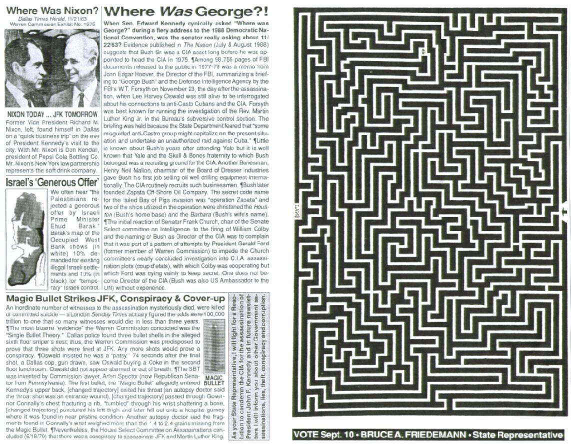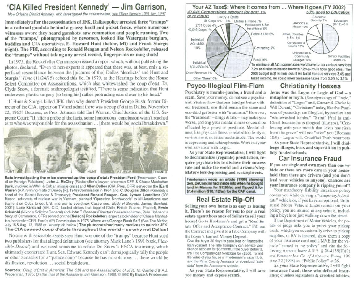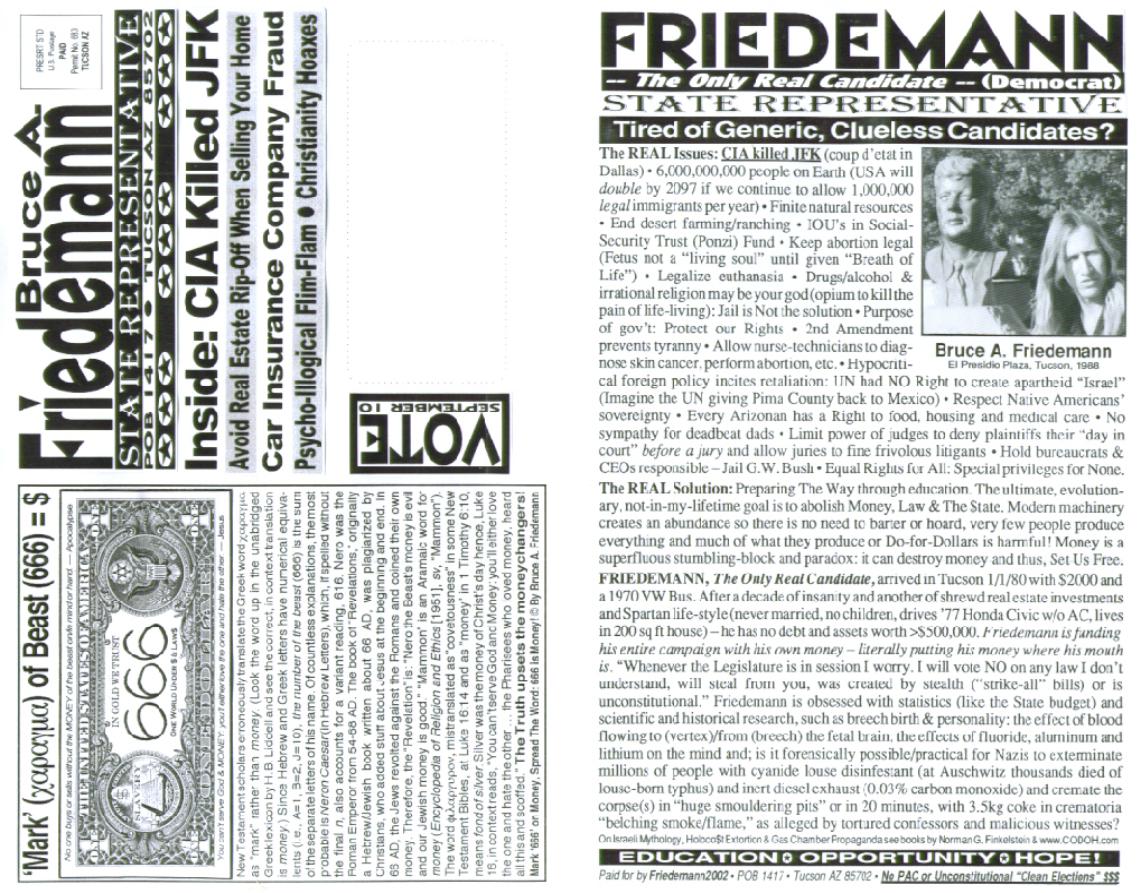 | Bruce A. Friedemann State Representative 2002 Campaign (I changed my name to Raquel Baranow in 2003) In another four way race Friedemann came in last. The two winners were "respectable" generic candidates. Friedemann spent about $4000 of his own money. His opponents spent four times that amount feeding from public campaign funds. The brochure was sent to 26,000 people in the District who were most likely to vote (based on public records of their voting history). |